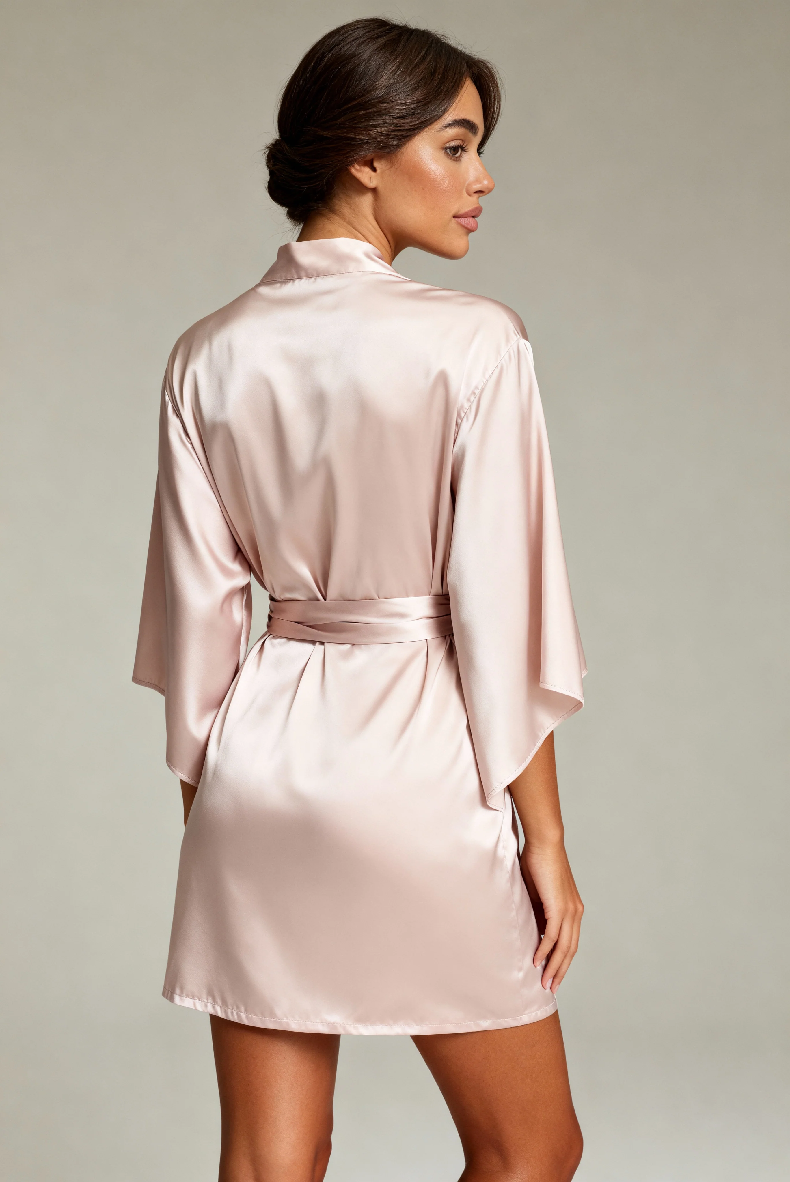 De satijn streelt je huid met zeldzame zachtheid. De perfecte snit omarmt je silhouet. De roze verfraait alle huidtinten. In de spiegel: verfijnd en vrouwelijk. Deze kimono wordt onmisbaar.