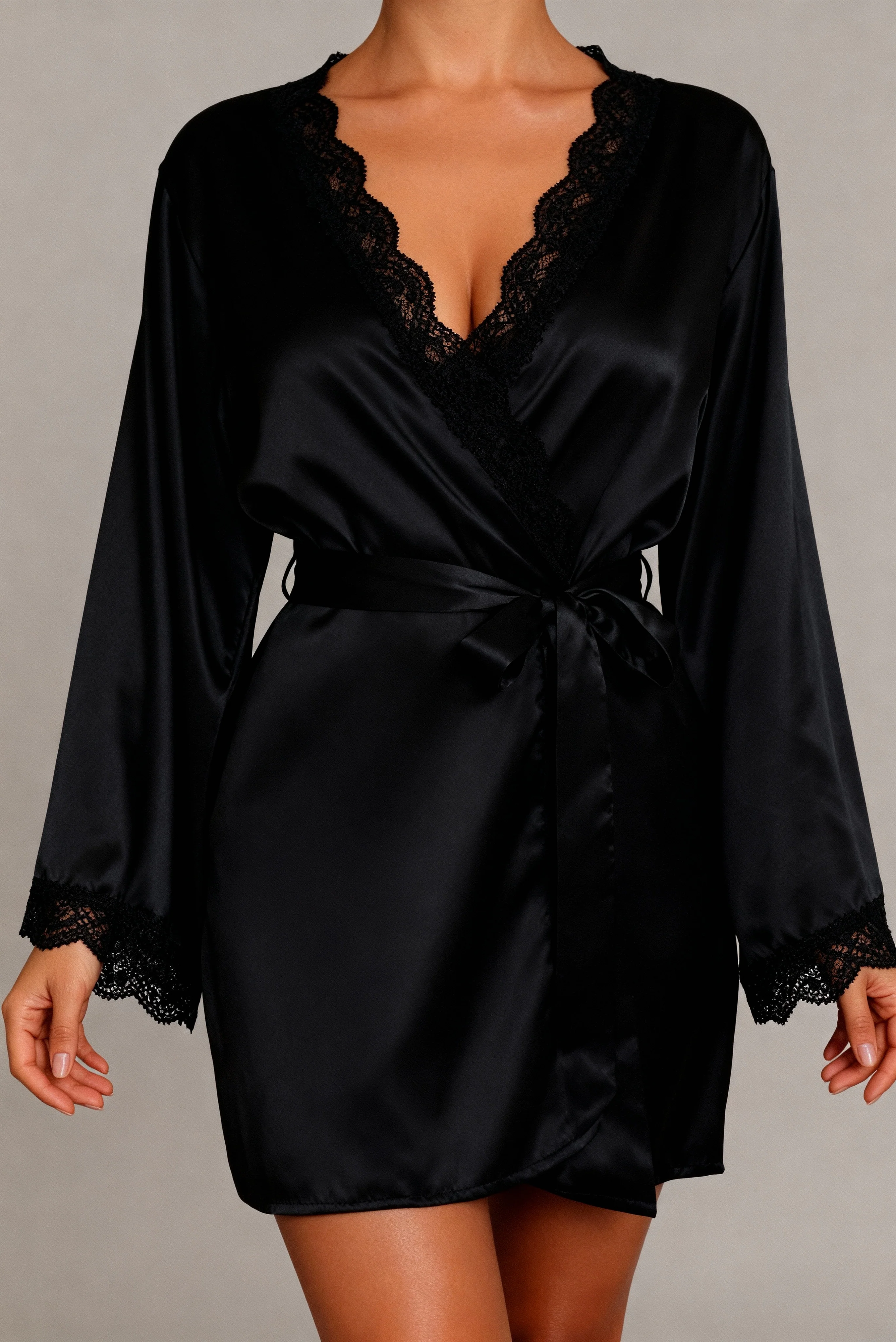 SOELIS heruitvindt de kimono. De zwarte satijn glijdt over je huid. De kant omlijst de halslijn met finesse. De mouwen eindigen met verfijnde afwerkingen. De satijnen riem knoopt om je taille. Dit is geen gewone kimono. Dit is de klassieker waar je op hebt gewacht.